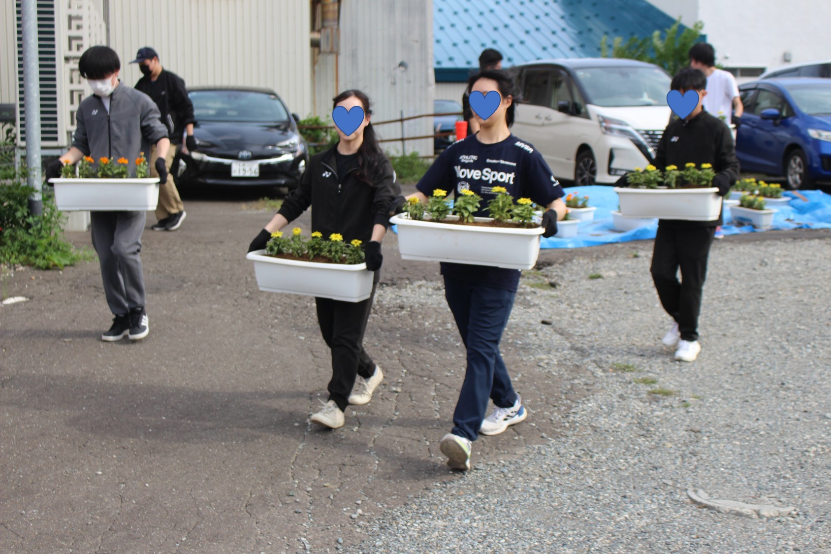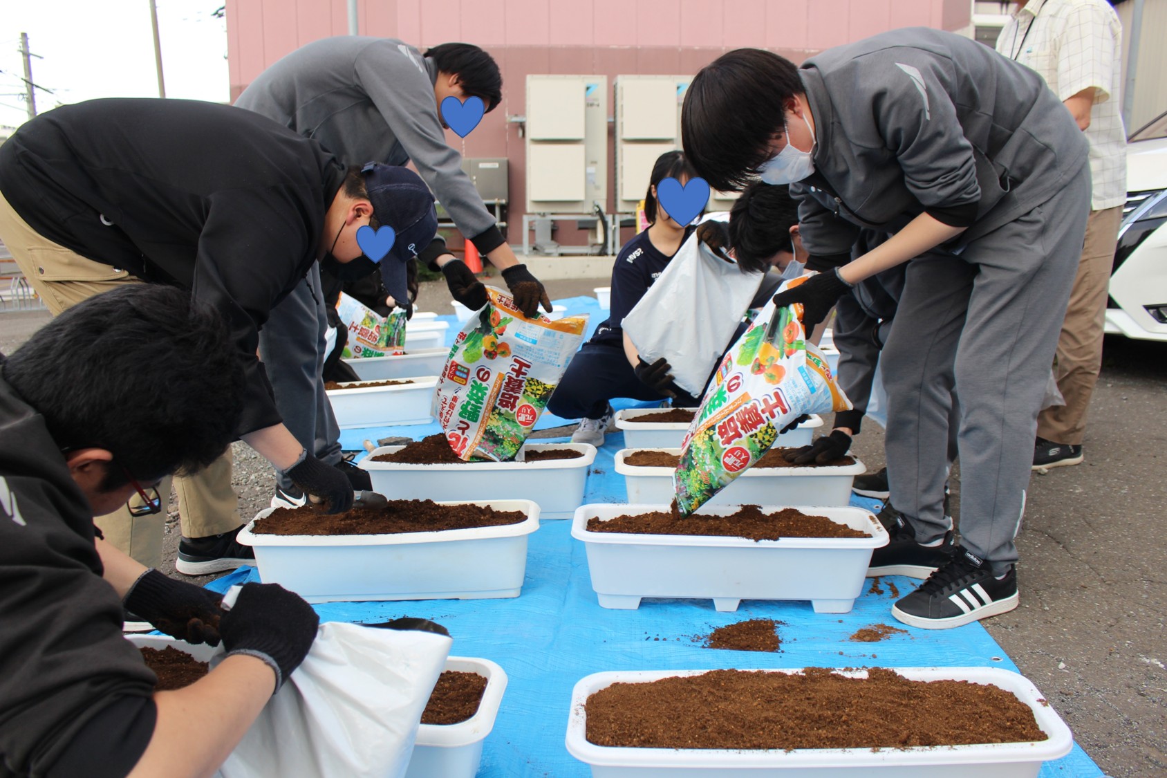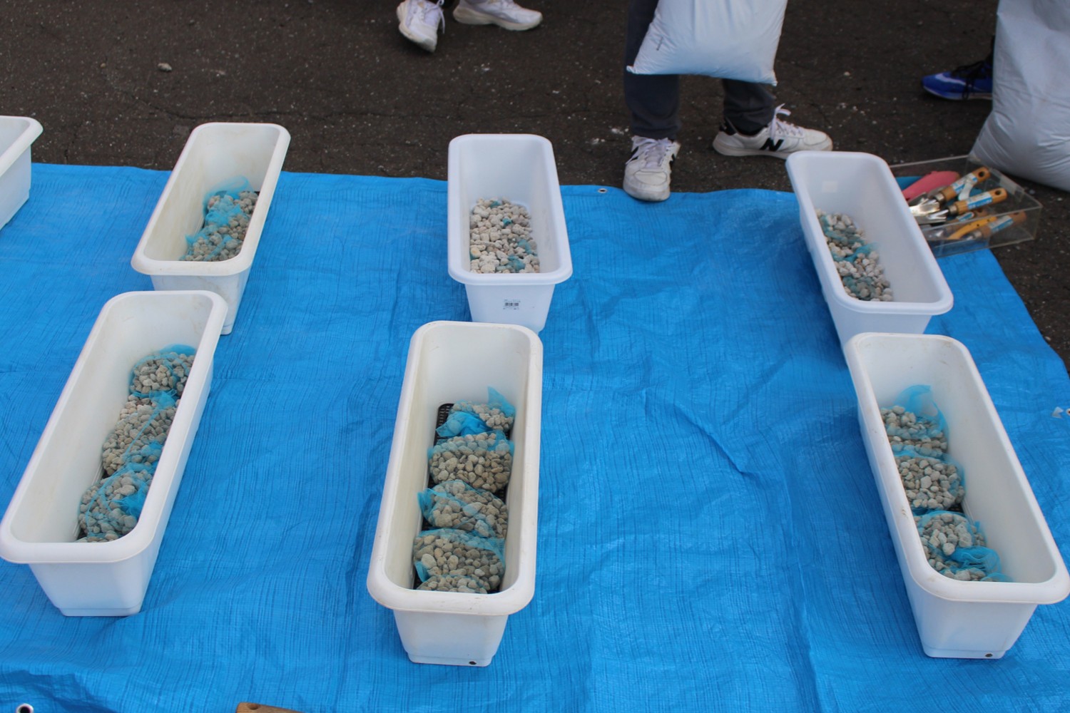 先日は、花を植えるための準備として、プランターの洗浄や、排水性や通気性をより良くするための小石を敷く作業などを行いました。