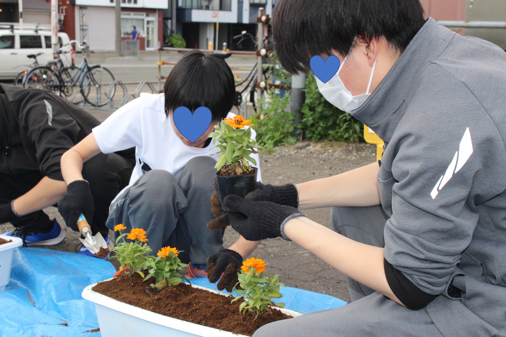 委員長・副委員長から作業の指示を行い、土をプランターに入れることから、花の植え付け、配置まで協力して全員が取り組みました。